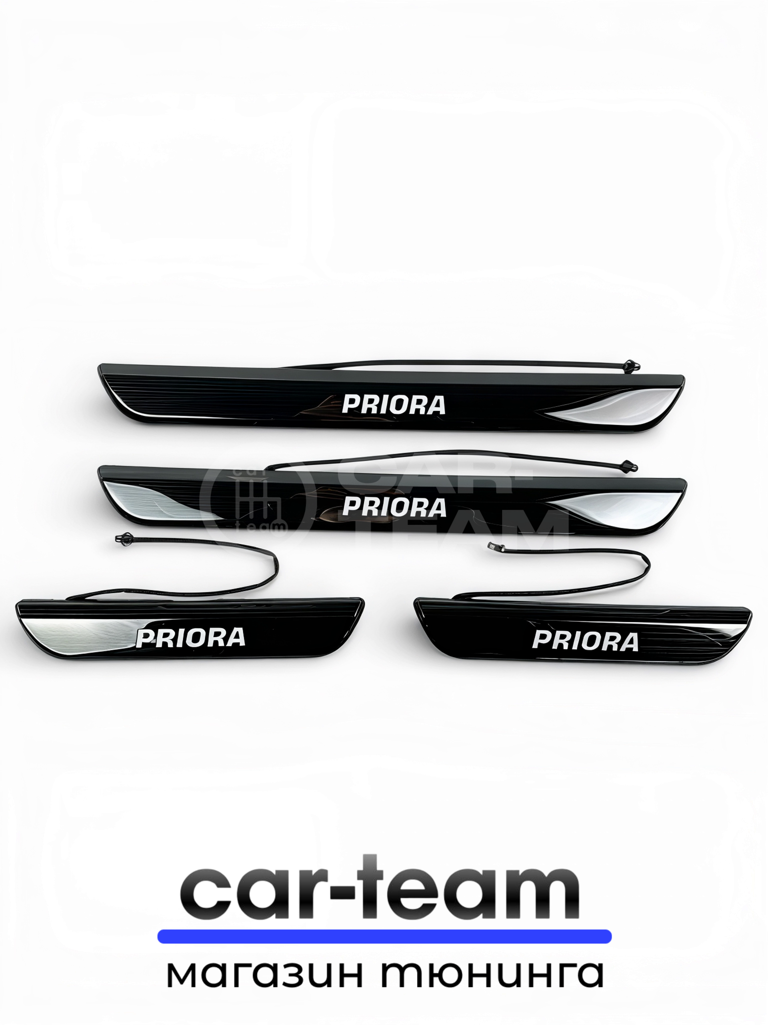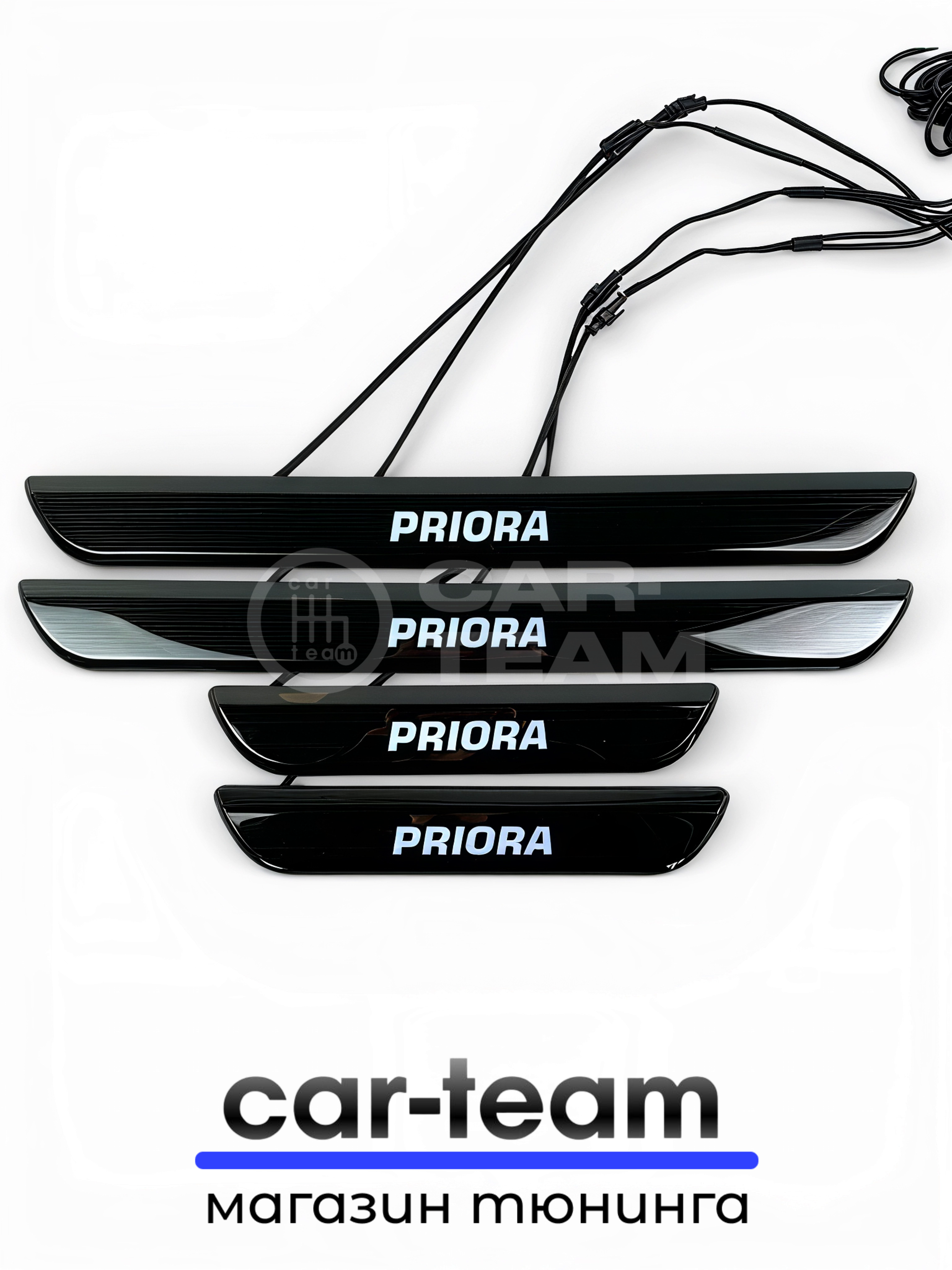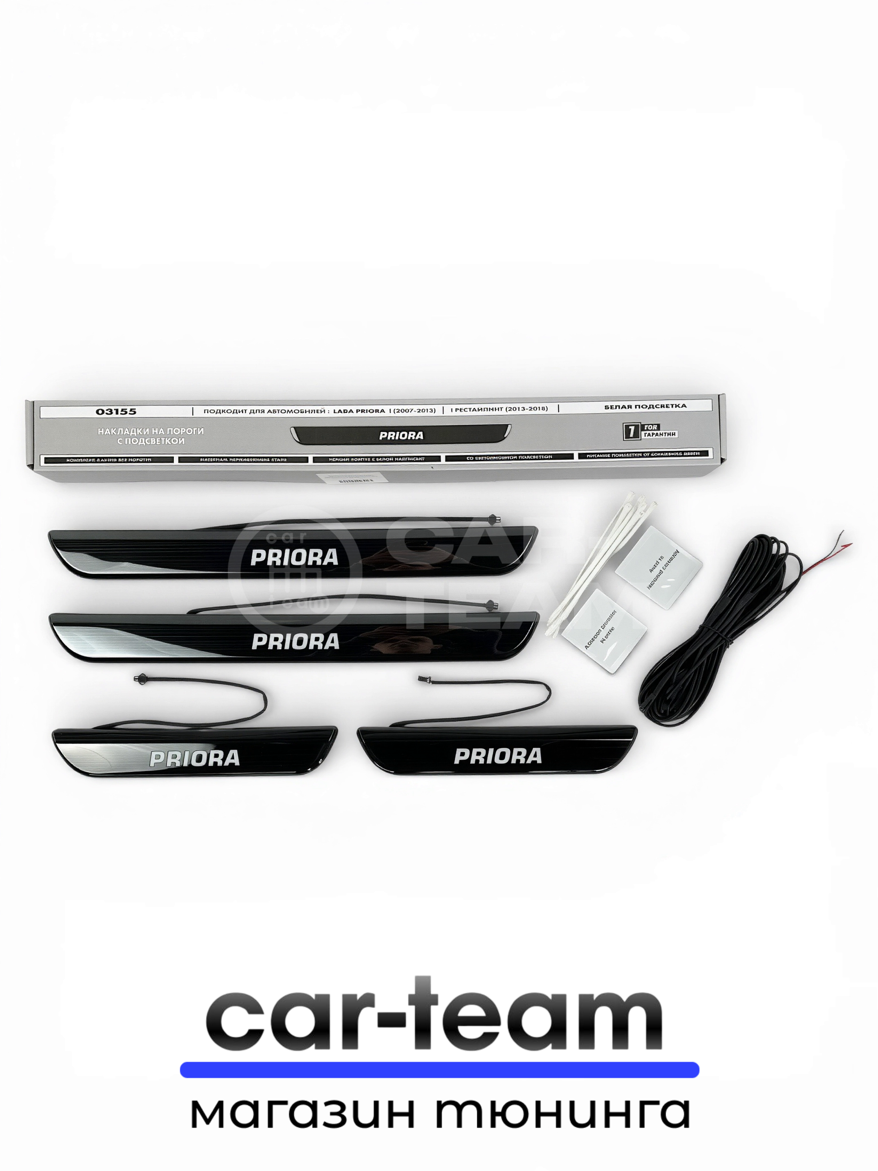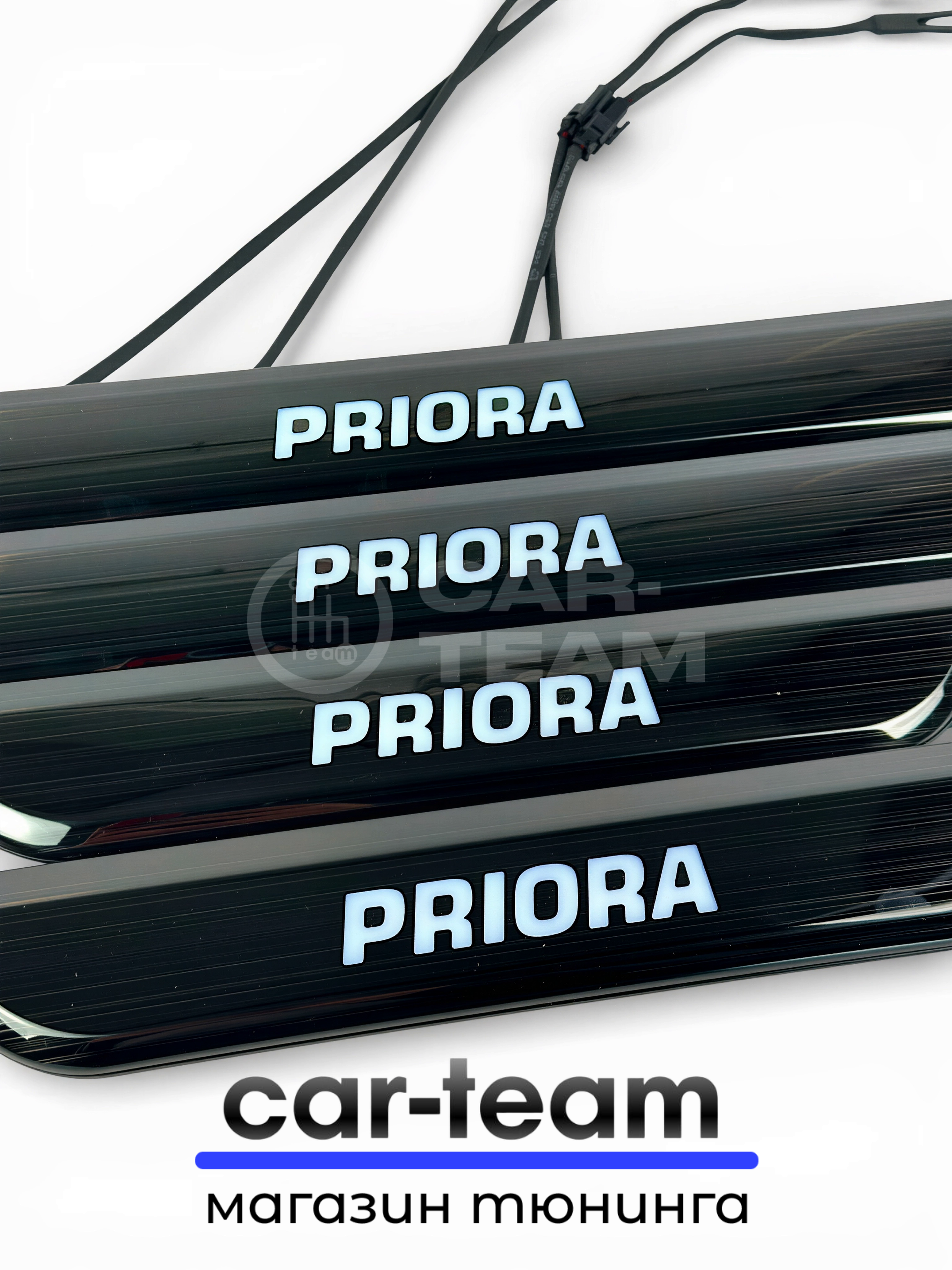 CAR-TEAM.RU дает гарантию на товары из своего каталога. “Накладки на пороги на Лада Приора светодиодные LED, ABS-пластик, белая подсветка (4шт)” будет исправно работать по своему предназначению.